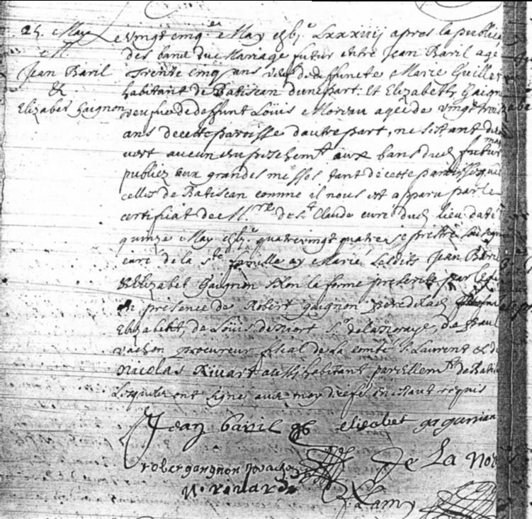 Who is Jean? | His descendants | Our Database | Genographic Project | Other Links Who is Jean Baril?Jean Baril, was born between 1646 and 1649 most likely in Saintonge, France. He died on 9 Feb 1724 in Batiscan, QC and was buried on 10 Feb 1724 in Batiscan, QC. He married three times: